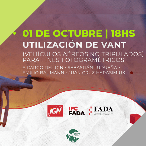 Los invitamos a participar de la Jornada virtual gratuita sobre uso de VANT’s (vehículos aéreos no tripulados) con fines fotogramétricos, organizada conjuntamente por el Instituto de Formación Continua de la FADA y el Instituto Geográfico Nacional (IGN).