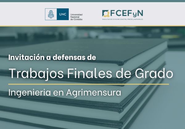 Desde la Cátedra de Trabajo Final, de la carrera de Ingeniería en Agrimensura, se invita a presenciar la “Defensa Oral” de los siguientes 3 (tres) Trabajos Finales, este próximo viernes 19 de septiembre. 1) Tema: “Asentamientos informales y organizaciones no gubernamentales: propuesta de innovación en la gestión de información territorial”.Alumno: Luna Santiago.Horario: 15 hs. 2)Sigue leyendo «Invitación a defensa de Trabajos Finales de Grado»