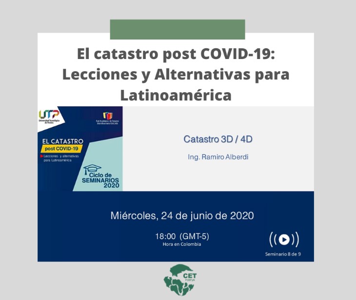 En el marco del Ciclo de Seminarios el Catastro Post COVID-19- Lecciones y alternativas para Latinoamérica, propuesto por la Universidad Tecnológica de Pereira (UTP), Colombia Se realizará el próximo Seminario el día Miércoles 24 de junio de 18:00 a 18:45. Conferencista: Ramiro AlberdiTema: Catastro 3D/4D. La transmisión se realizará desde YouTube Live para ingresar click Aquí FormularioSigue leyendo «Seminario Catastro 3D/4D. Universidad Tecnológica de Pereira»
