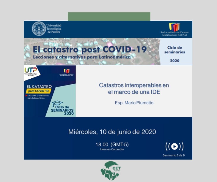 ¡PRÓXIMO SEMINARIO! El próximo miércoles 10 de junio de 18:00 a 18:45, el director del Centro de Estudios Territoriales, Agrim. Mario Piumetto, realizará la presentación del seminario, Catastros interoperables en el marco de una IDE. La transmisión se realizará desde YouTube Live ingresando a través del siguiente link: https://aprende.utp.edu.co/inicio/ver-curso/cicloseminarios-catastro Formulario de Inscripción Extemporánea (solo lo debes diligenciar siSigue leyendo «Próximo seminario – El catastro post COVID-19»