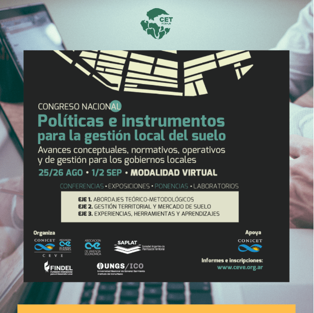El Congreso Políticas e instrumentos para la gestión local del suelo«Avances conceptuales, normativos, operativos y de gestión para los gobiernos locales», procura promover un espacio de intercambio plural de discusión interdisciplinario y federal, de carácter crítico y propositivo, entre instituciones referentes del país en materia territorial y urbana. Se busca no sólo enriquecer los avances teóricos y operativos, sino también colaborar con el Plan Nacional de Gestión de Suelo Urbano a partir de la socialización de aportes conceptuales, referencias formativas y herramientas de gestión disponibles, que puedan potenciar el trabajo en los municipios y comunas del país. Desde esta perspectiva se pretende fortalecer la incidencia de los conocimientos generados en la agenda pública, a partir del abordaje interactoral y federal en torno a la gestión del suelo en nuestros territorios.