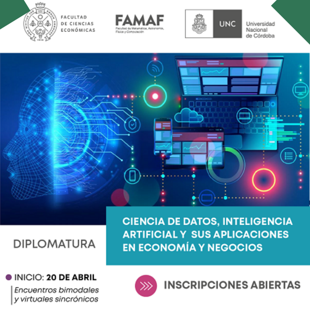 Se encuentra abierta la inscripción a la «Diplomatura en Ciencia de Datos, Inteligencia Artificial y sus Aplicaciones a Economía y Negocios». Esta diplomatura es dictada en forma conjunta por la Facultad de Ciencias Económicas (FCE) y de Matemática, Astronomía, Física y Computación (FAMAF) de la UNC.